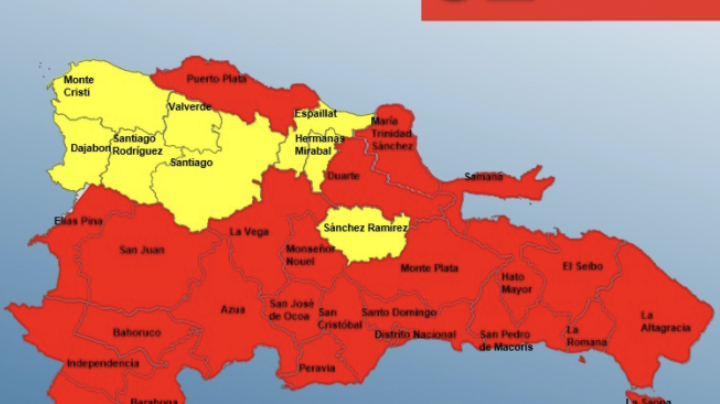 En efecto, están en alerta roja Santo Domingo, San Pedro de Macorís, María Trinidad Sánchez, El Distrito Nacional, La Romana, Monte Plata, San Cristóbal, San José de Ocoa, La Altagracia, Peravia, Azua, La Vega, Barahona, Pedernales, Monseñor Nouel, San Juan, Bahoruco, Hato Mayor, Independencia, Elías Piña, El Seibo, Puerto Plata, Duarte y Samaná.