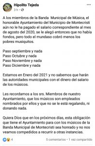 Según denunció Hipólito Tejada, en su Red Social de Facebook, el Ayuntamiento Municipal de Montecristi desde Agosto del año pasado 2020 no efectúa el pago correspondiente a los Músicos o Banda de Música Municipal.