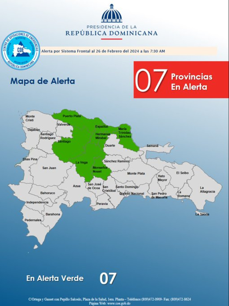 Mientras que el Centro de Operaciones de Emergencias (COE), emitió alerta verde contra posibles inundaciones para las provincias Hermanas Mirabal, María Trinidad Sánchez, Monseñor Nouel, Espaillat, Puerto Plata, La Vega y Santiago.