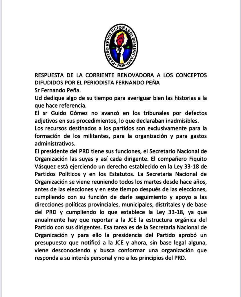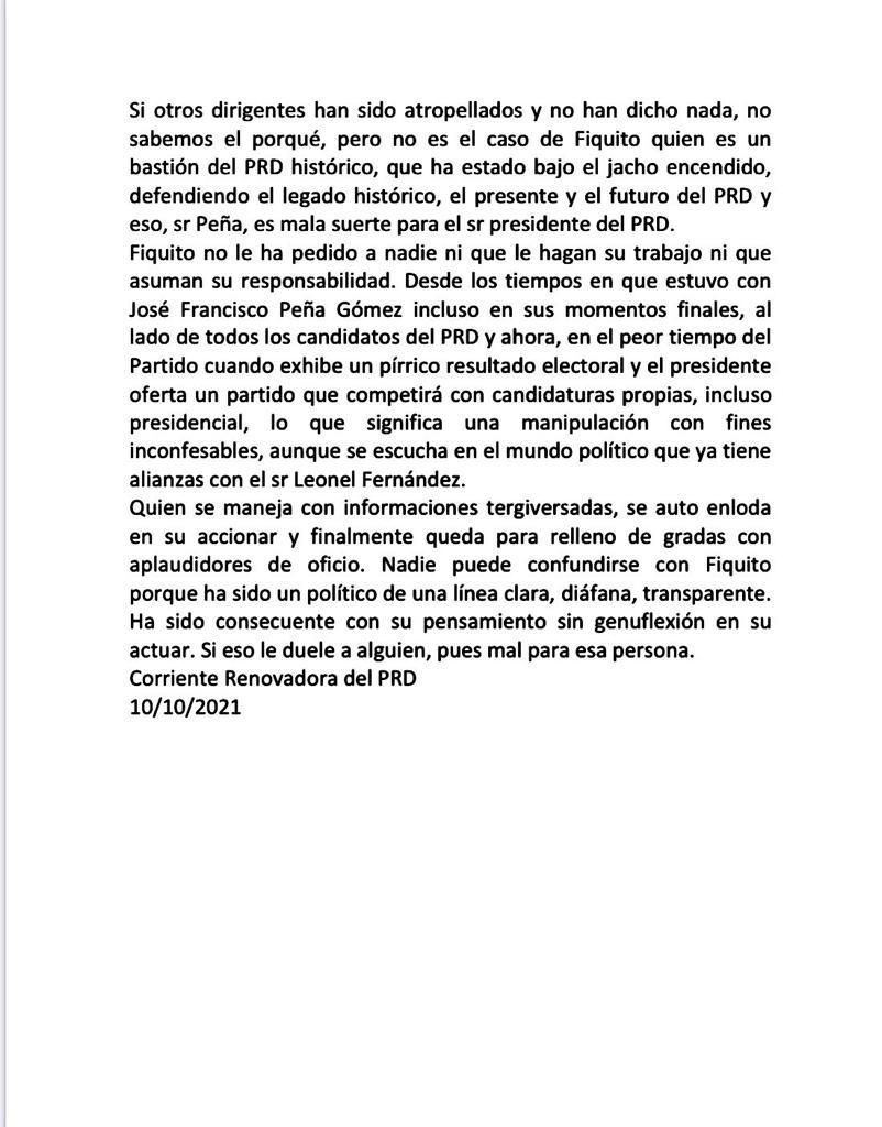 Si como dicen en su escrito respuesta “ Fiquito no le ha pedido a nadie ni que le hagan su trabajo ni que asuman su responsabilidad”, debe entonces amonestar a los que en su nombre hacen sueltos y asumen la injuria y calumnia contra el PRD y sus autoridades, contra el presidente y nuevo líder del PRD, Miguel Vargas. Que le quite ese trabajo que hacen en las redes y que vaya Fiquito a las reuniones, se reúna con la institucionalidad partidaria para asumir la agenda y el cronograma del partido. Sencillo.